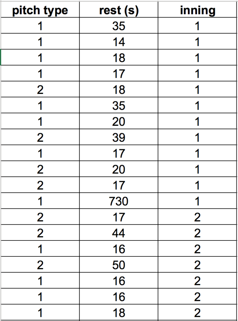 Every pitch, organized by inning and sequence, for an individual pitcher in an individual game. That value on the left – the sv_id from the gameday atbats table, contained the date (YYMMDD_HHMMSS). Everything I needed to calculate the amount of time between each pitch.